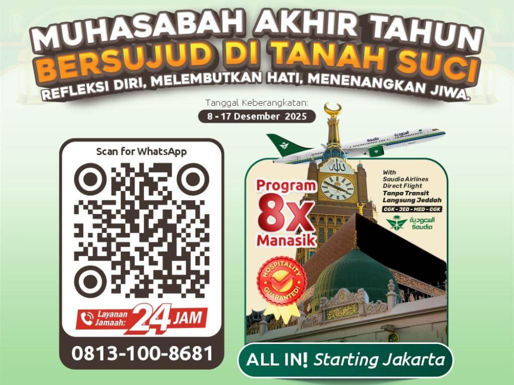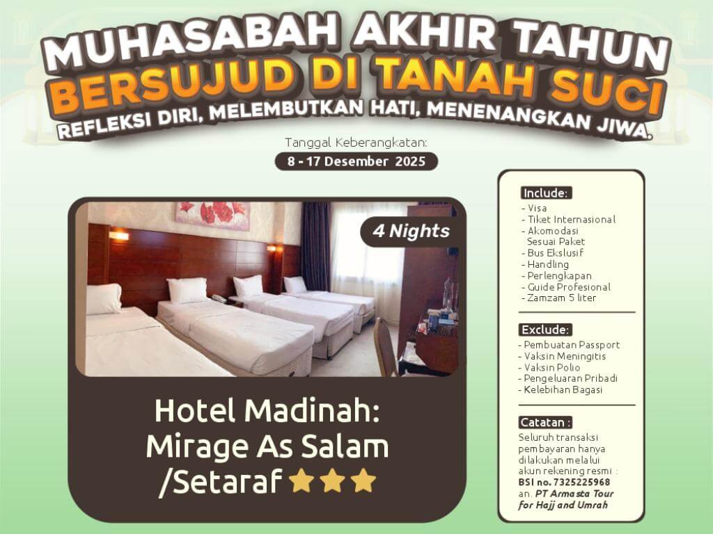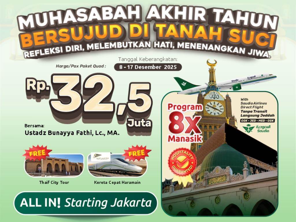 - Perlengkapan : Koper kabin, koper bagasi, tas paspor, kain ihram/mukena, sandal, buku manasik, kain seragam, syal, & sabuk